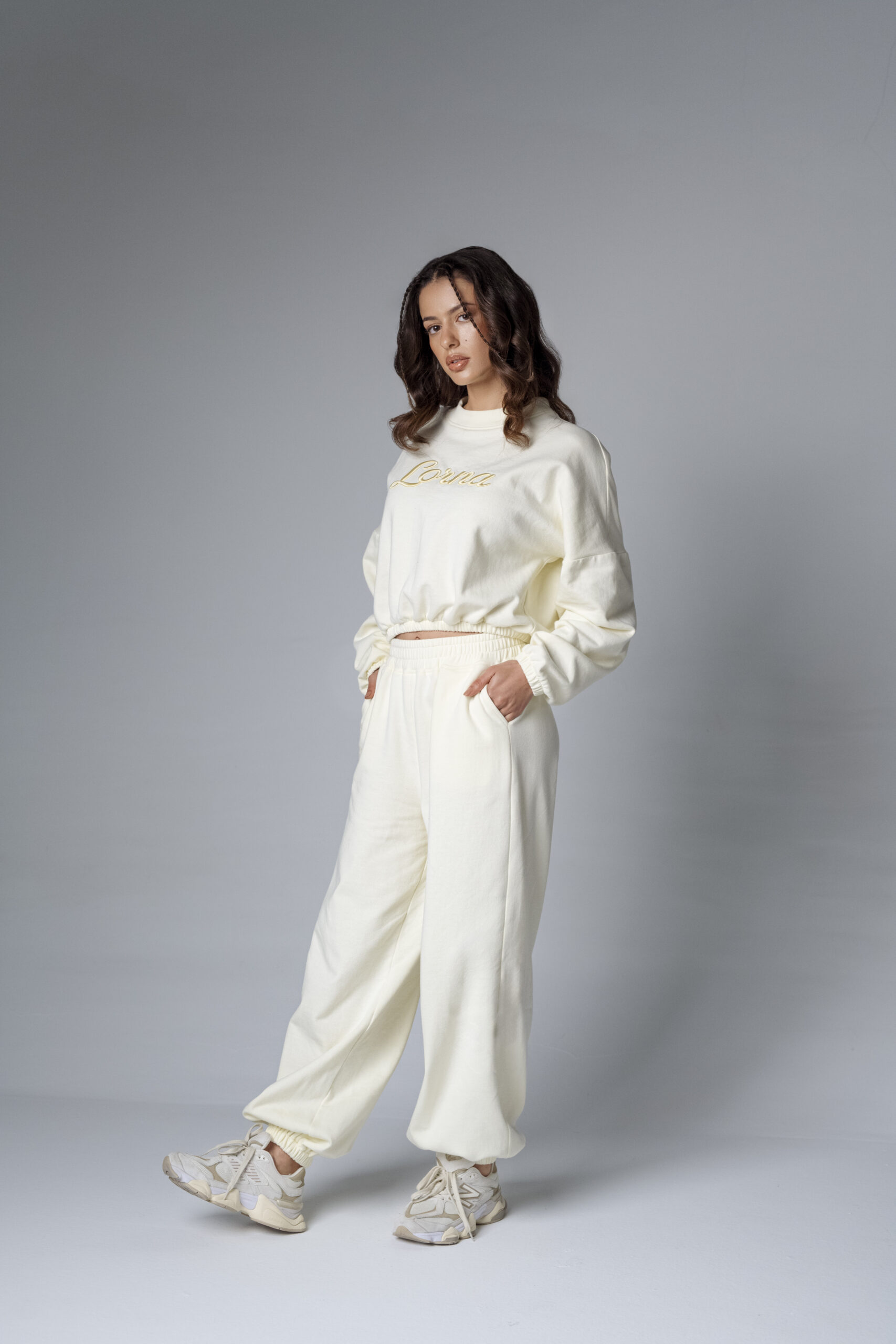 Crafted from premium cotton fleece, it features a relaxed sweatshirt with subtle embroidered detailing and matching pants designed for ease and structure. The clean silhouette delivers a timeless, elevated aesthetic.